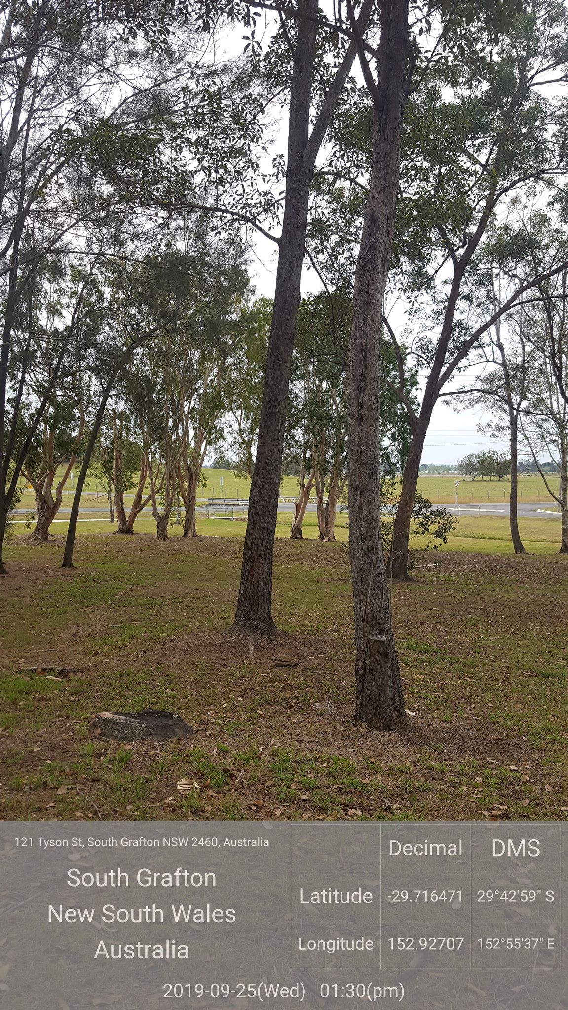 For example, the photo below was taken today, the 25th of September 2019, at 1:30PM of a few trees in the park across from the Council Rushforth Rd depot at 121 Tyson St, Sth Grafton (-29.716, 152.927). This image was taken with Address and Lat/Long, but the Map + Lat/Long is even better!
